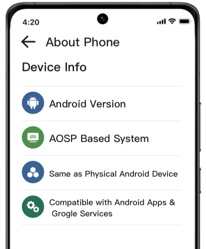 Android Cloud Phones run real Android OS, ensuring 100% compatibility with Android apps, including Google Play, social media apps, and mobile games.